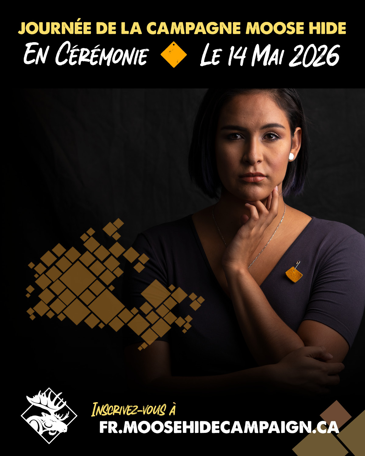 La Campagne est ancrée dans des rites et des modes d’apprentissage et de guérison traditionnels autochtones. L’épinglette de peau d’orignal est une pierre angulaire de la Campagne Moose Hide. En portant l’épinglette de peau d’orignal, vous affichez votre engagement à honorer, à respecter et à protéger les femmes et les enfants dans votre vie, et à dénoncer la violence fondée sur le genre et la violence familiale. À ce jour, plus de cinq millions d’épinglettes de peau d’orignal ont été distribuées gratuitement dans des communautés, des écoles et des lieux de travail partout au Canada.
